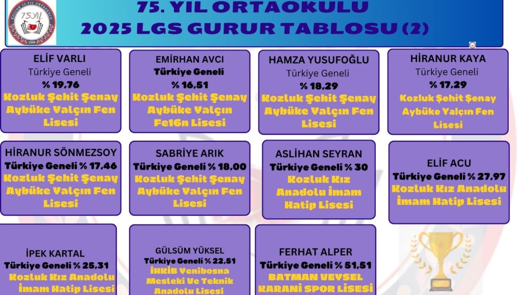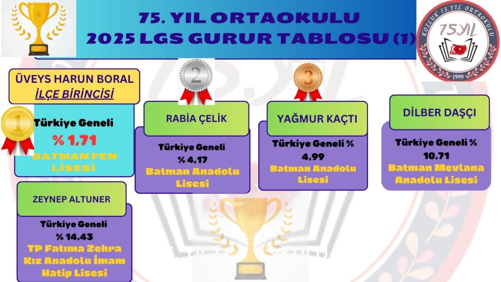 2024-2025 Eğitim ve öğretim yılında LGS sınavına giren 8.sınıf öğrencilerimizden büyük bir başarı elde edildi. Öğrencilerimizden Üveys Harun BORAL Türkiye Geneli %1,71'lik dilime girerek İlçe birincisi olmuştur. Ayrıca toplamda 7 öğrencimiz Fen Lisesine yerleşti. 2 Öğrencimiz Batman Anadolu Lisesi, 1 Öğrencimiz Batman Mevlana Anadolu Lisesi, 1 öğrenci Batman TP Fatıma Zehra Kız Anadolu İmam Hatip Lisesi, 3 öğrencimiz Kozluk Kız Anadolu İmam Hatip Lisesi (Proje Sınıfı), 1 öğrenci İHKİB Yenibosna Mesleki Ve Teknik Anadolu Lisesi ve 1 öğrencimiz de Batman Veysel Karani spor lisesini kazanmıştır. Öğrencilerimizin bu başarısında emeği geçen idareci, öğretmen ve velilerimize teşekkür eder öğrencilerimzi tebrik ederiz.